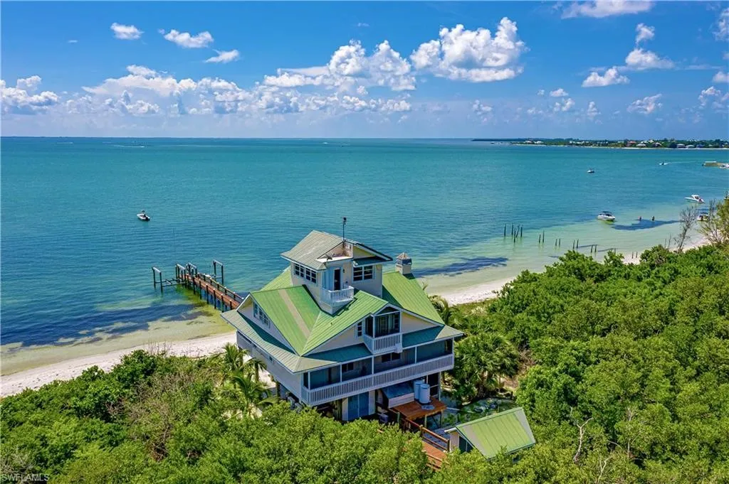 The fairy tale comes true... toes in the sand, showering beneath a coconut palm tree. Your luxury off the grid lifestyle in Ultimate Privacy begins here on the beach, surrounded by over 5 ACRES of Cayo Costa state parkland. Huge screen porches & hammocks in the shade provide the perfect getaway from today's hectic world. The majestic interior is clad with gleaming custom crafted woodwork from top to bottom. This house will charm you from your first step upon your private dock. Four bedrooms and three baths, all with spectacular views. The first level offers soaring ceilings and a double story field-stone fireplace. The perfect focal point rivaled only by the wide water views of Pine Island Sound. Gourmet kitchen has stainless appliances including a Thermador gas range and hood. The third-floor captain's watch has impressive views for miles in all directions. Solar system includes two new state of the art lithium batteries with over 30KW of storage.Property Details